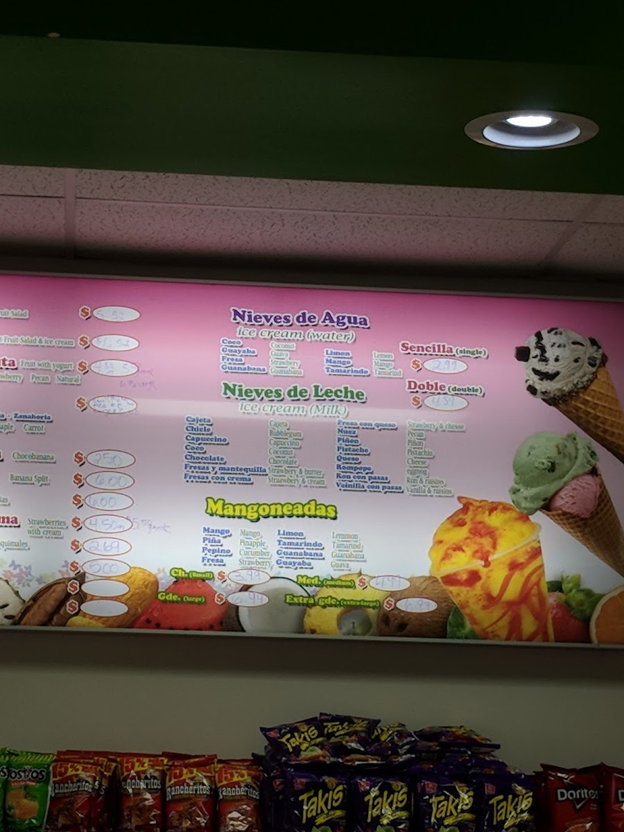 - Mangonadas - 100% mango ice cream creations topped with diced mango, Chamoy, lime, and tajin, ranging from $8.50 to $13.50 depending on size.